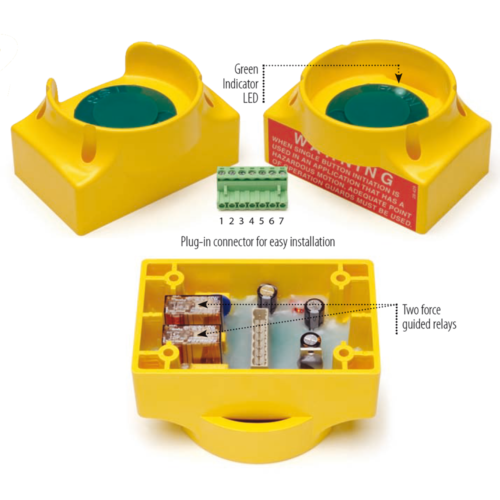 The current method of simultaneously pressing hard on two spring loaded mechanical buttons in order to initiate the cycle of a machine has been shown to cause a serious wrist injury commonly known as Carpal Tunnel Syndrome. Soft touch buttons eliminate the need to press. Simply touching the green detection zone generates the start command. This gentle motion of the hand and wrist virtually eliminates all stressful and strainful forces associated with pushing mechanical buttons.